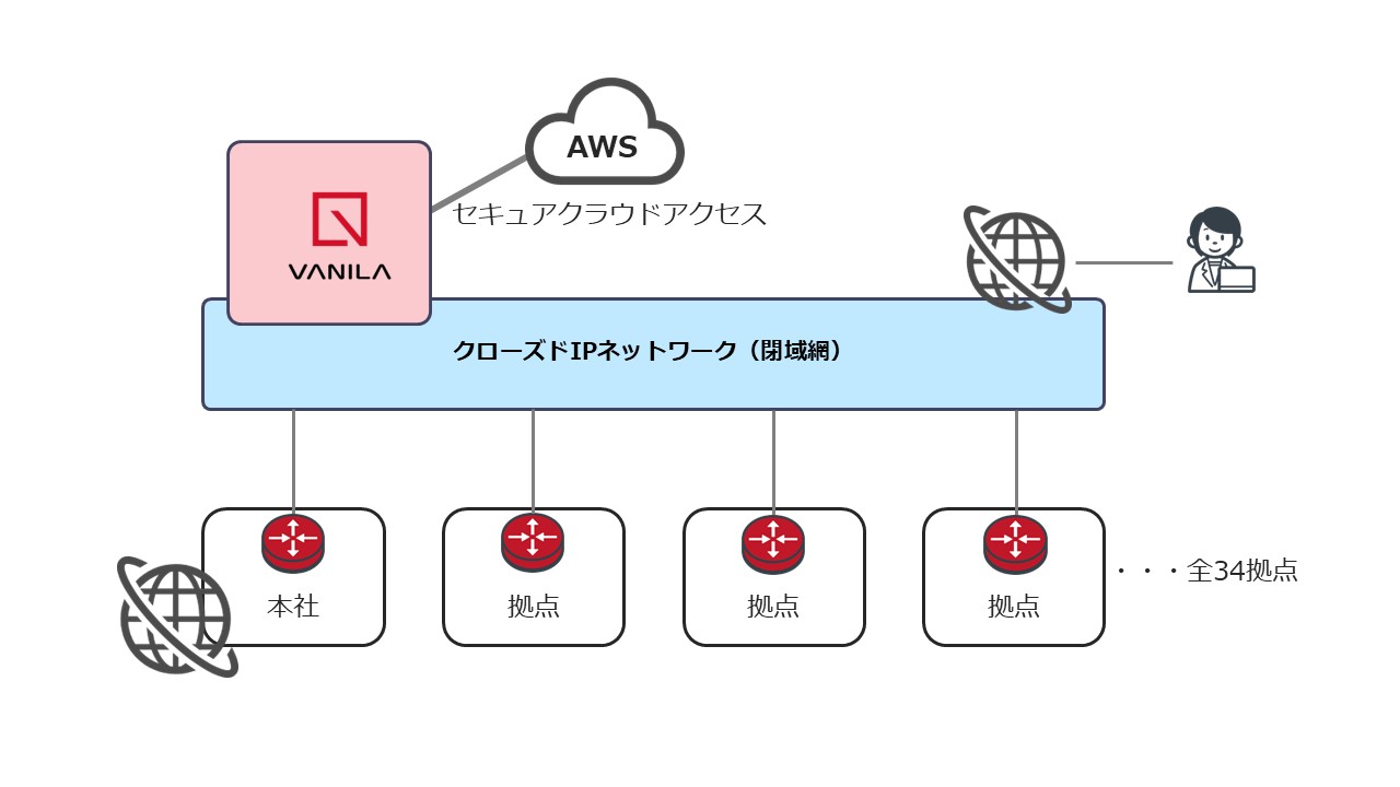 この解決に向け、AWS(Amazon Web Services)への移行を決定。全国34拠点間の閉域網を維持したまま、AWSとセキュアに接続するため、「VECTANT セキュアクラウドアクセス」とNFV(Network Functions Virtualization)技術を活用したクラウドサービス「VANILA」を導入し、拡張性と俊敏性に優れたネットワーク基盤を実現した。