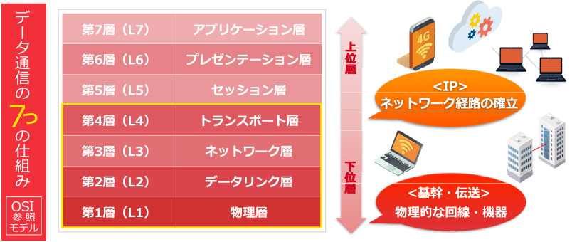 一般的には、OSI参照モデルの上位層まで含めて扱うエンジニアをネットワークエンジニア、当社で活躍するネットワークエンジニアは、第1層(L1)から第4層(L4)までを扱っています。当社では、L1に位置づけられる物理的な回線や機器による伝送を扱う基幹系エンジニアと、L2~L4にあたるIPネットワーク経路の確立を扱うIP系エンジニアがいます。