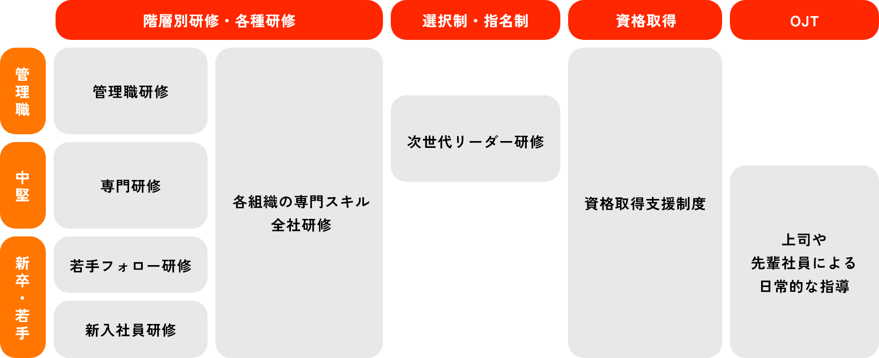 経営戦略や方針に沿って、全社員が共通して学ぶ研修を実施。集合研修やeラーニングなど多様な形式で、主体性を育み、組織全体で学び合う文化を醸成します。